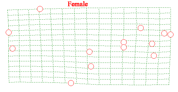 Figure 8A. Relative warp number 1 of a thin plate spline comparison of male and female average wing landmarks of three wild type Drosophila melanogaster strains.